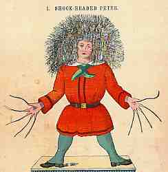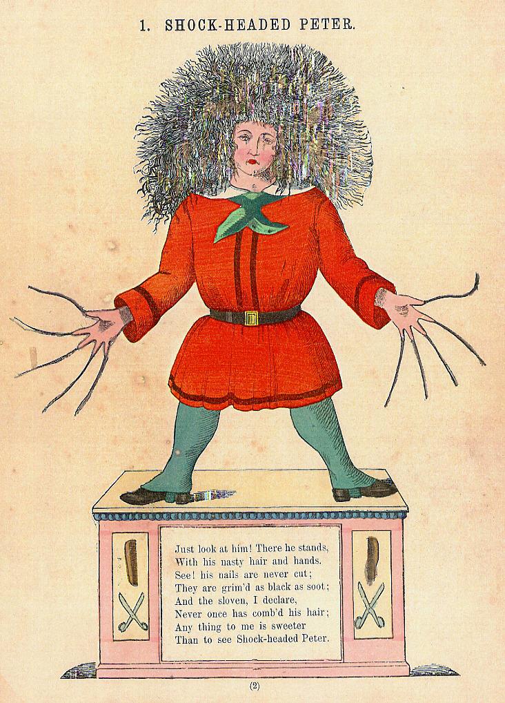 Just look at him! There he stands, With his nasty hair and hands. See! his nails are never cut; They are grim'd as black as soot; And the sloven, I declare, Never once has comb'd his hair; Any thing to me is sweeter Than to see Shock-headed Peter.