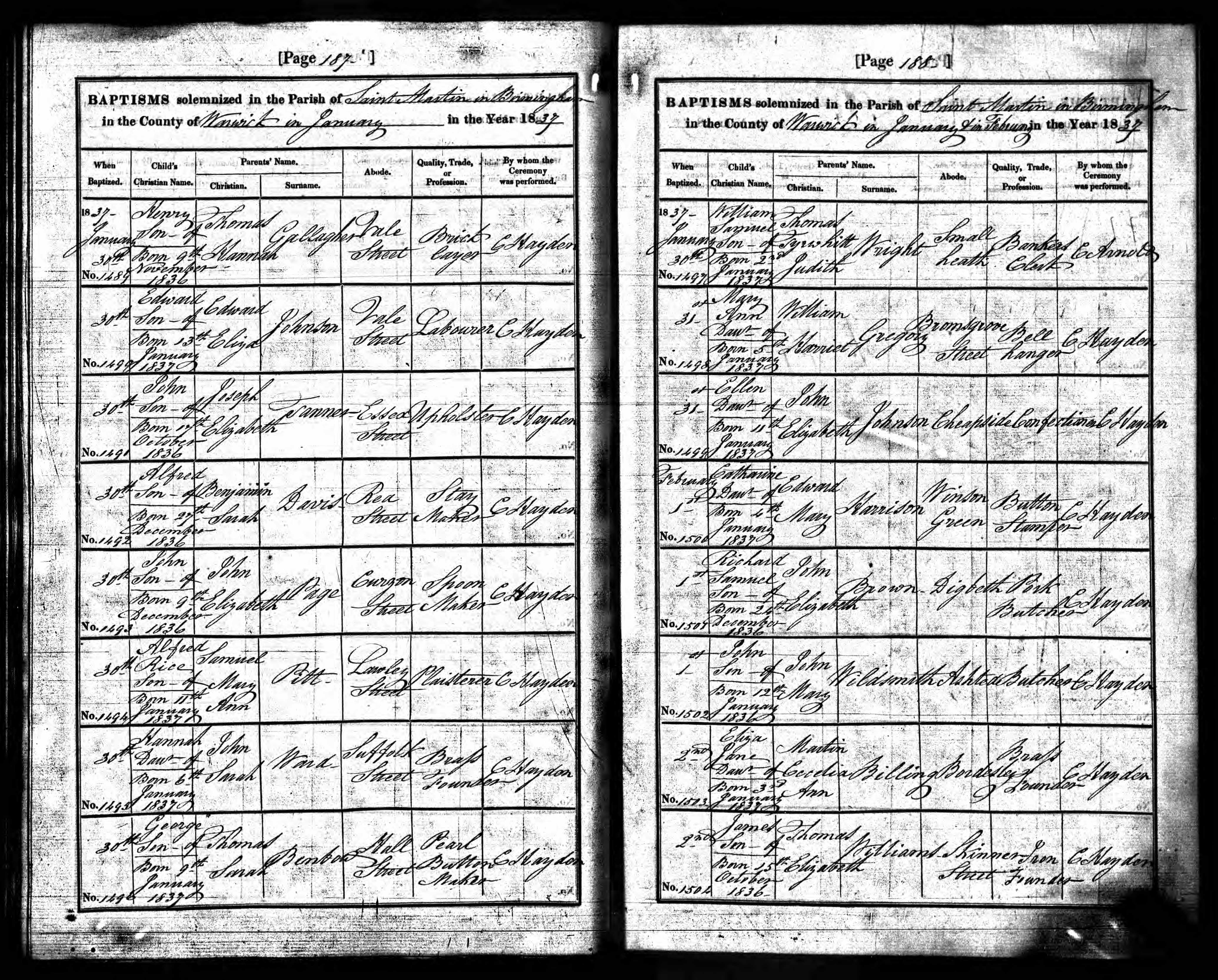 ![]() baptism entry: Henry Pemberton and Alfred Joseph and Edwin Isaac Billing 1837 St Martin, Birmingham bap1837_henry_pemberton+alfred_joseph+edwin_isaac_billing.jpg 5680x4528 2.7Mb |