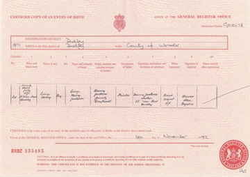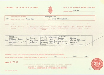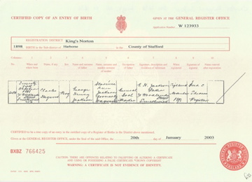 ![]() birth certificate: Joan Margaret Jackson 10 December 1930 Mar 1931 Birmingham S. volume 6d page 150 Mother Eaton b1930_joan_margaret_jackson.jpg 3430x2480 2.9Mb |