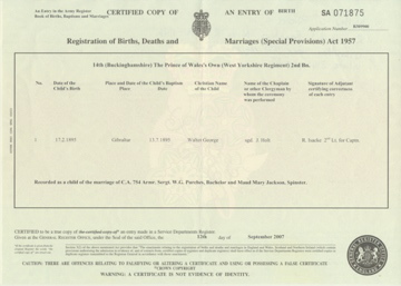 ![]() baptism certificate: Walter George Purches 17 February 1895 Regimental Registers 1761 - 1924: Gibraltar year 1895 regiment 14th volume 814 page 22 b1895_walter_george_purches.jpg 3491x2491 3.8Mb |