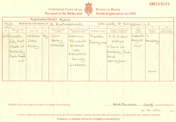 ![]() birth certificate: William John Henry Baker 7 July 1920 copy obtained from haslucks Ancestry family tree b1920_william_j_h_baker.jpg 2256x1565 1.8Mb |