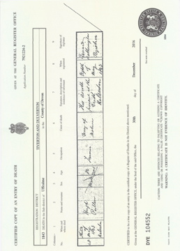 ![]() death certificate: Thomas Jackson 30 Dec 1845 Mar 1846 Aston volume 16 page 115 age 2 d1846_thomas_jackson.jpg 2480x3447 2.3Mb |