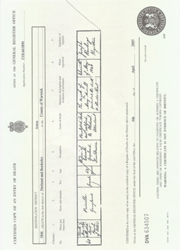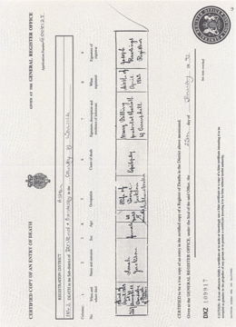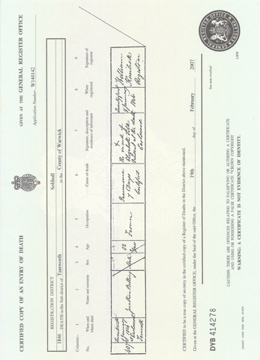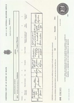 ![]() death certificate: Priscilla Grayland (formerly Wallins) 16 March 1891 Jun 1846 Aston volume XVI page 121 d1846_priscilla_grayland.jpg 2480x3431 2.3Mb |