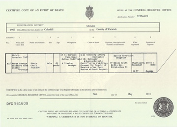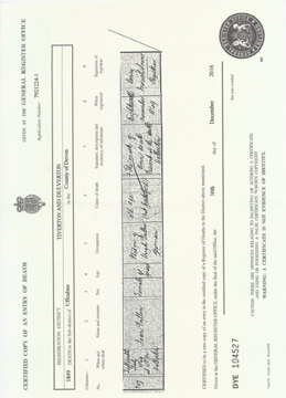 ![]() death certificate: John Youle 15 April 1847 Jun 1847 Kings Norton volume 18 page 33 age 78 d1847_john_youle.jpg 3509x2550 1.5Mb |