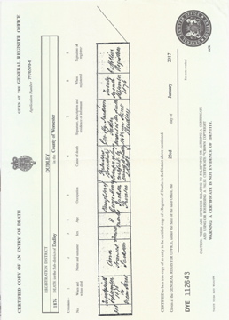 ![]() death certificate: Jonathan Billing 17 January 1846 Mar 1846 Solihull volume XVI page 325 d1846_jonathan_billing.jpg 2480x3428 2.6Mb |