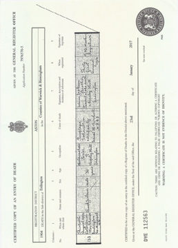 ![]() birth certificate: Mary Ellen Jackson 14 November 1871 Dec 1871 Aston volume 6d page 333 mother Dyer b1871_mary_ellen_jackson.jpg 2480x3438 1.7Mb |