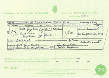 ![]() marriage certificate: Walter George Purches 22 July 1846 Sep 1846 Epsom volume 4 page 121 m1846_walter_george_purches.jpg 3448x2467 3.4Mb |